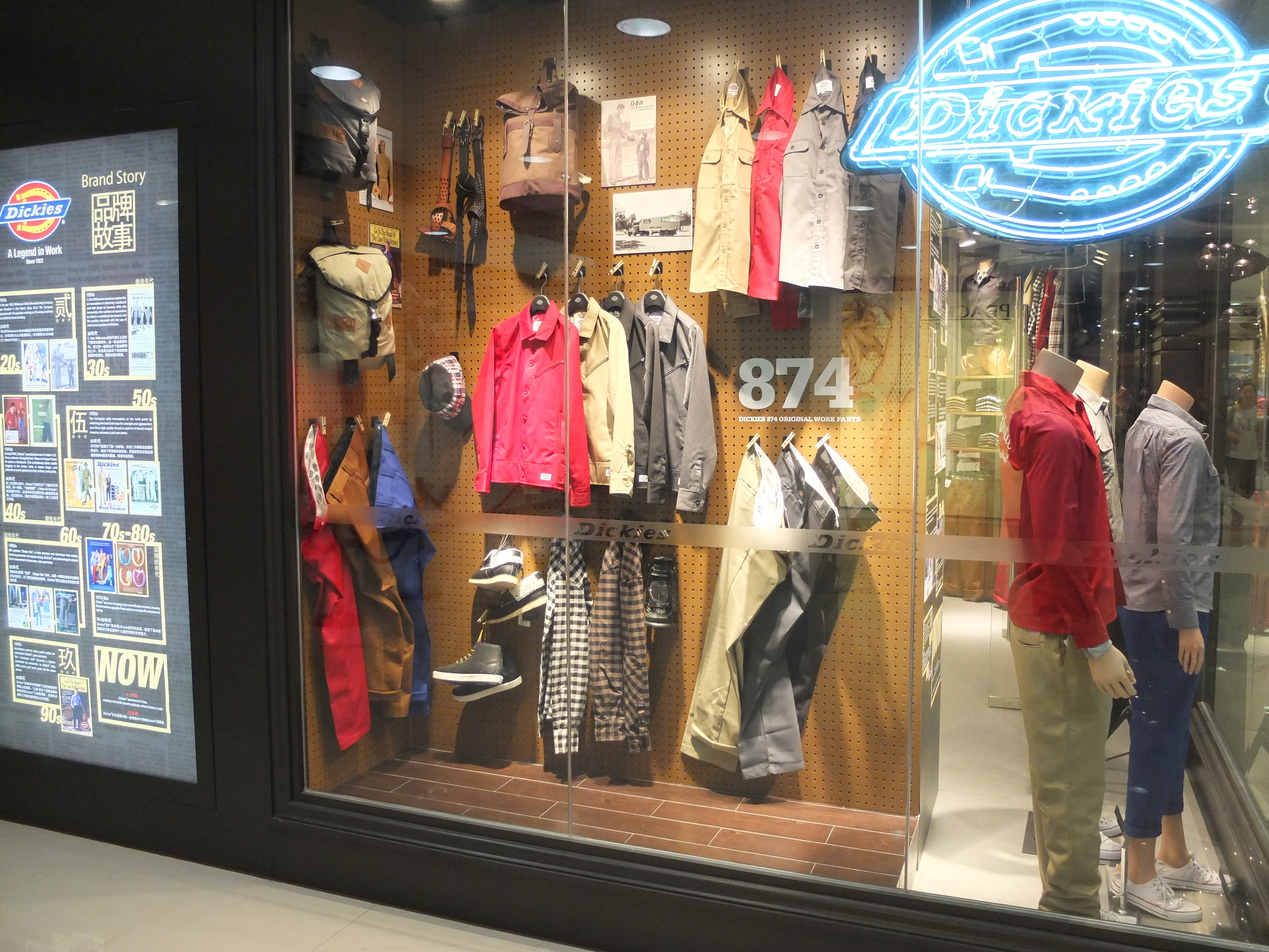 Initially working on a brand positioning and store evaluation exercise, we were briefed on a complete store format and brand environment re-design. After a six-month period of design development and prototyping of the key elements, the scheme was translated into locations and formats across China. The Dickies flagship opened on the prestigious East Nanjing Road in Shanghai, in September 2011. The project builds on the authenticity of the Dickies brand heritage, focussing on the brand values of affordable, high quality, durable and fashionable garments and showcasing them in a brand environment that encapsulates the Dickies essence, whilst remaining flexible, modular and practical – suitable for a fast-fashion retail brand. As part of the shopfront design we refined the logo, creating a greater visual impact and reinforcing the brand’s fashion credentials.